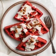 Sourdough red velvet waffles are a fun, delicious way to use up sourdough starter discard. Made with cocoa powder, buttermilk, and just a hint of sourdough, these waffles are crisp on the outside and fluffy on the inside. Finished with a rich cream cheese glaze, every bite tastes like dessert for breakfast. Make them right away or let the batter ferment overnight for even deeper flavor. Simple to make and perfect for Valentine’s Day!